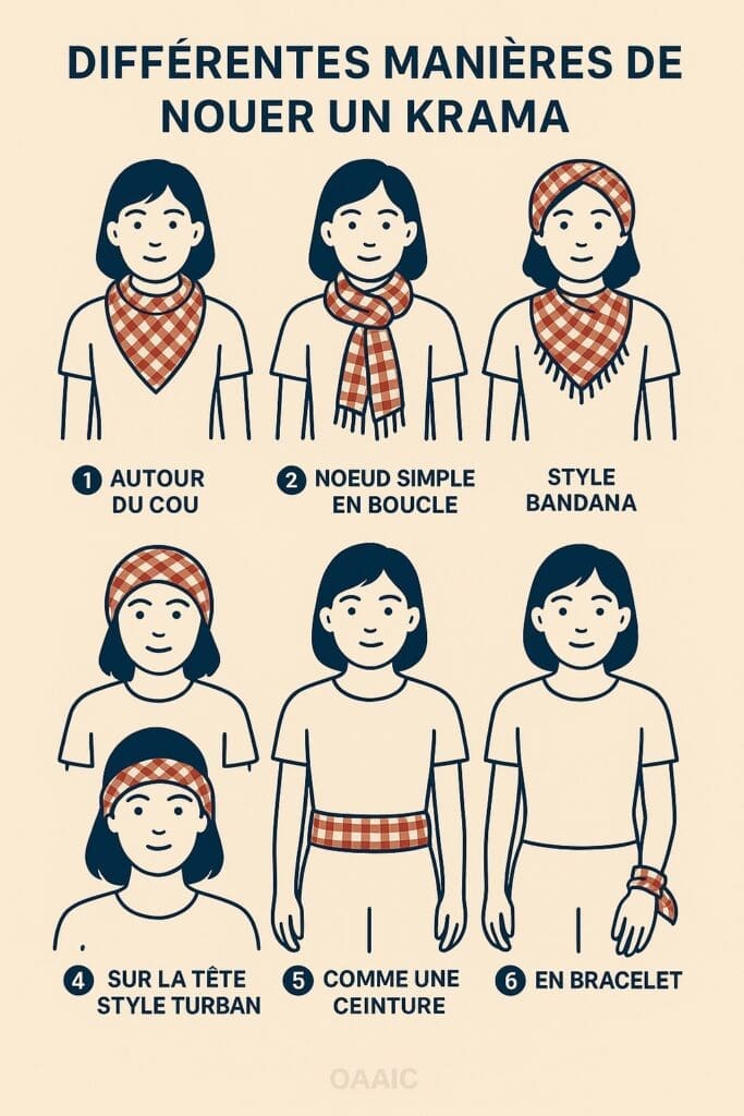 Astuce : Choisissez un Krama aux couleurs vives pour réveiller un look sobre, ou optez pour des tons naturels pour un effet plus discret.